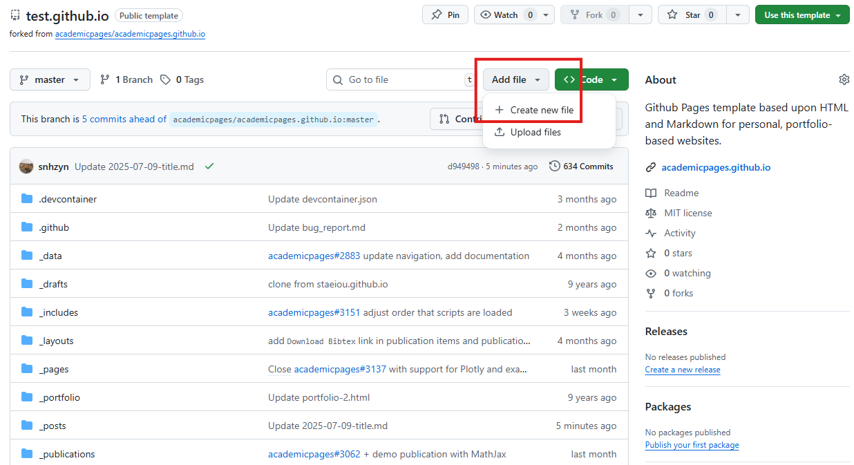- In your repo, click Add file → Create new file