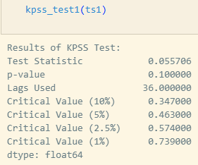 즉, 일반적으로 사용되는 95% 유의수준(α = 0.05) 기준에서 봤을 때, 현재 p-value는 0.1이므로 귀무가설을 기각할 근거가 없으므로 정상 시계열 데이터라고 해석할 수 있습니다.